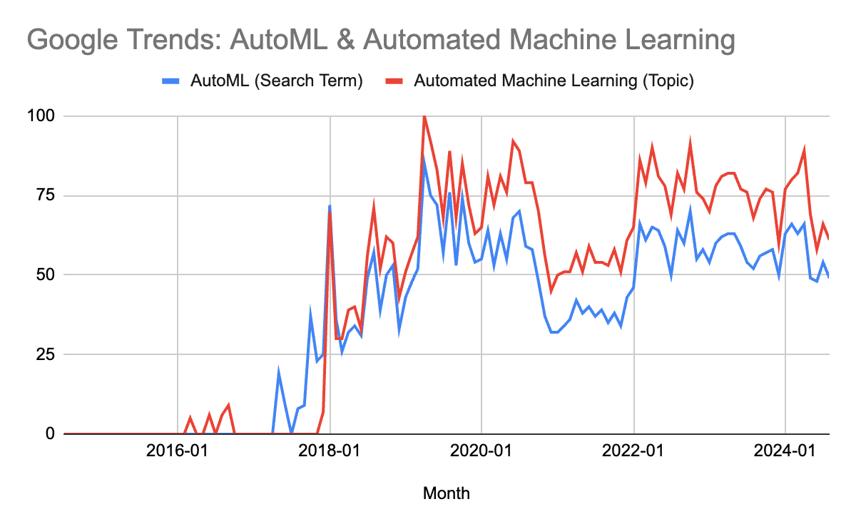 Yet AutoML didn't revolutionize data science as promised; and in fact, there is generally a sense of skepticism about AutoML in the data community. You can see in the Google Trends that the popularity of AutoML today is below its peak in 2019.